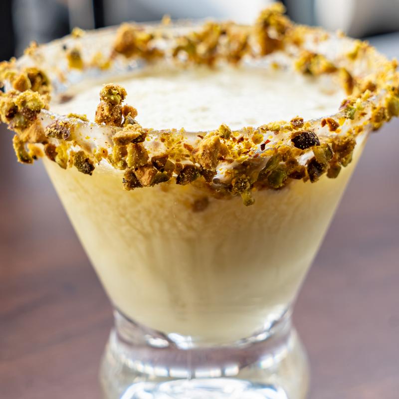 Stoli Vanilla, pistachio cream liqueur, white chocolate liqueur, amaretto, splash of milk, pistachio nut rim